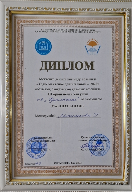 Балаларды ерте дамыту институтының 2022 жылға арналған жұмыс жоспарына сәйкес ұйымдастырылған "Мектепке дейінгі үздік ұйым-2022" республикалық байқауының қалалық кезеңінен бөбекжай бақшамыз жүлделі IІІ-орынмен марапатталды.